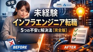 フリーター・未経験 未経験インフラエンジニア転職5つの不安と解決法【完全版】 未経験からインフラエンジニアに転職したいけど不安な方へ。スキル・年齢・夜勤・年収・ブラック企業の5つの不安を、実体験をもとに1つずつ解決方法まで解説します。 2026.04.10 フリーター・未経験業界・職種研究